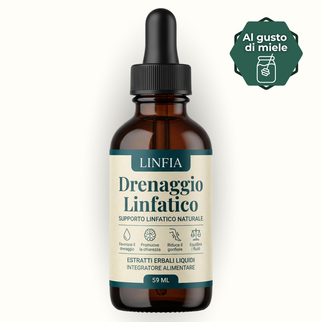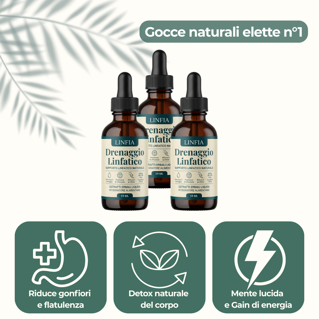 Le gocce per il drenaggio linfatico LINFIA sono formulate per sostenere il naturale processo di detossinazione del corpo, aiutando a ridurre gonfiore, ritenzione idrica e sensazione di pesantezza, migliorando al tempo stesso la circolazione e i livelli di energia.
